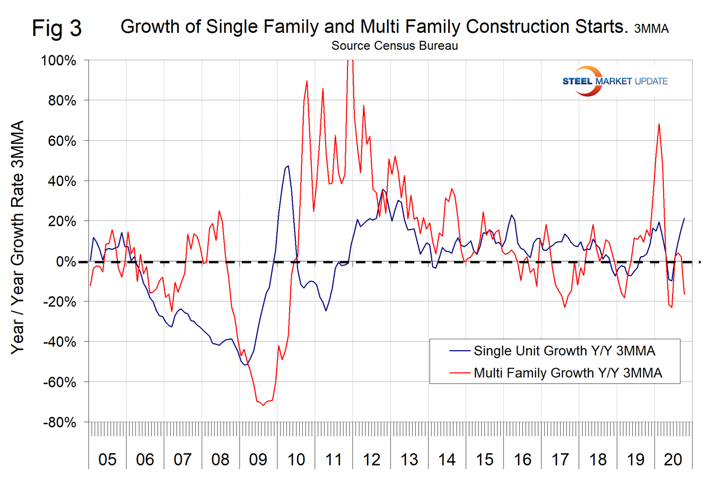 Excluding property improvements, single-family residential expanded by 8.3 percent in three months through October with positive momentum and multifamily residential expanded by 14.6 percent also with positive momentum. Seven of the nine sectors within nonresidential construction declined and momentum was negative for all except the religious buildings. The CPIP that is the main focus of this report is based on spending work as it proceeds; the value of a project is spread out from the project’s start to its completion. The Census Bureau reports separately on construction starts in which data for the whole project is entered into the database when ground is broken. Total housing starts expanded by 9.3 percent in three months through October year over year. The total is broken down into single-family and multifamily starts. Single-family starts expanded by 21.3 percent and multifamily declined by 16.6 percent in three months through October year over year. Figure 3 shows the growth of both housing sectors since January 2005.