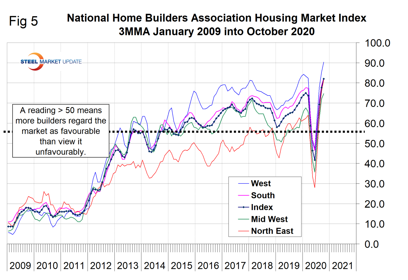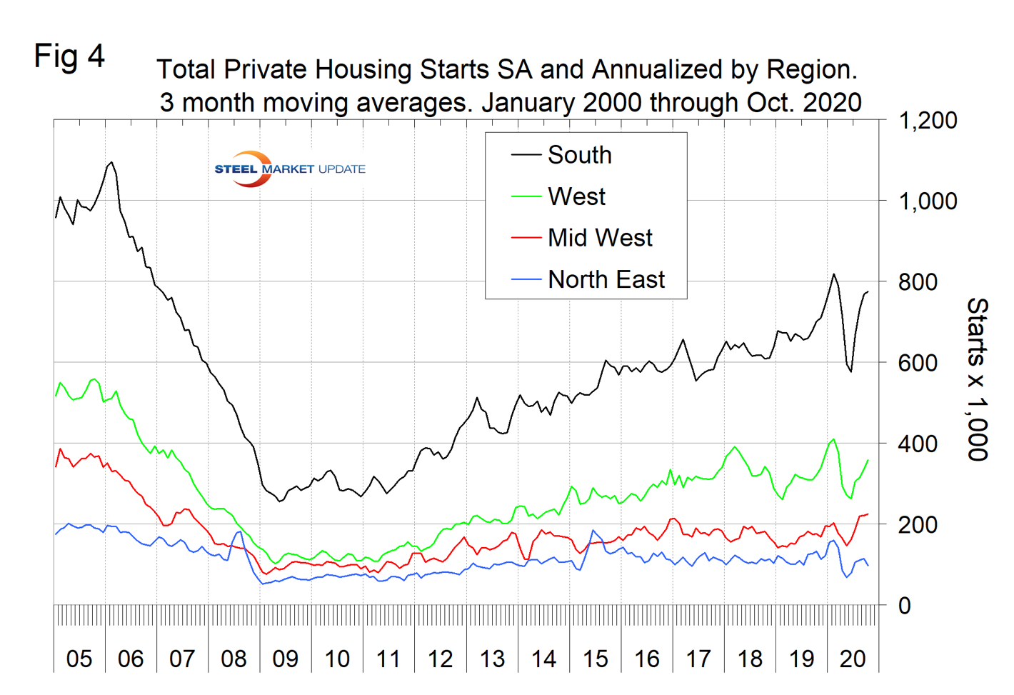 Figure 4 shows total housing starts in four regions with the South being the strongest and the Northeast the weakest. All four regions suffered major declines this year beginning in March, but have partially recovered since May. The National Association of Home Builders optimism index crashed in April and recovered each month May through October as shown in Figure 5.