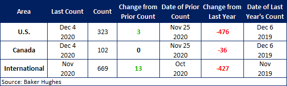 International rigs increased by 13 to 669 rigs for the month of November, a decrease of 427 rigs from the same month one year ago. For a history of both the U.S. and Canadian rig count, visit the Rig Count page on the Steel Market Update website here.