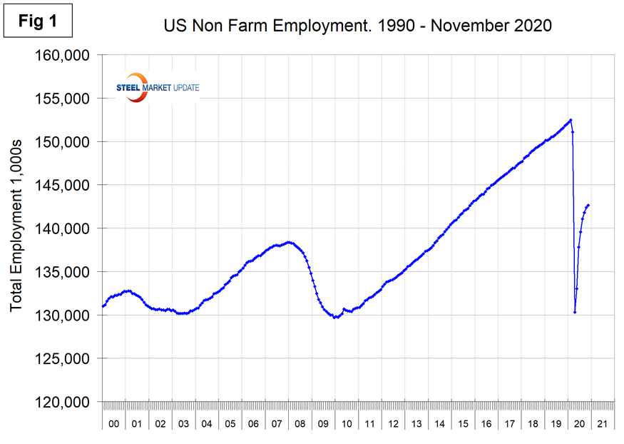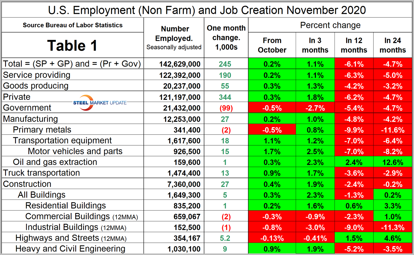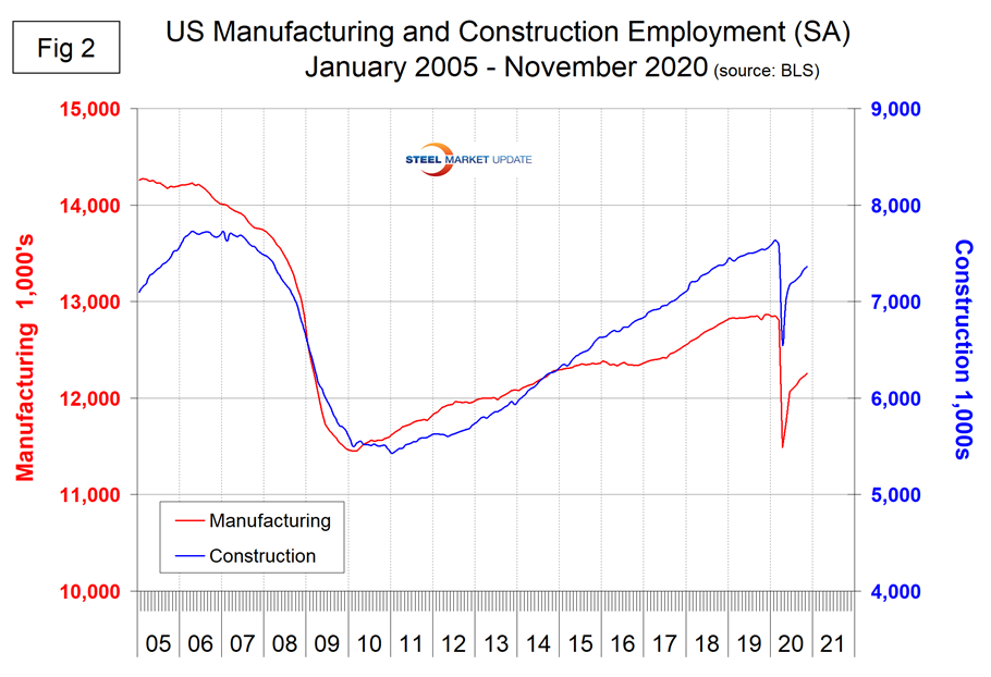 SMU Comment: Primary metals underperformed total manufacturing in November losing 200 jobs. Transportation equipment, including motor vehicles and parts, had the best month since June. Goods-producing industries, which are mainly in the manufacturing and construction sectors, continued to perform better than the service sector in November. The pandemic is worsening and that trend is projected to accelerate through the winter months. The vaccine-driven improvement won’t affect the employment situation until early spring. The pace of economic recovery could slow this winter, with a similar effect on steel consumption.