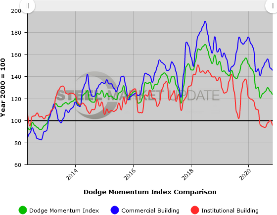 “Since the expiration of support programs in the CARES Act, the economy has struggled to maintain traction and in its wake planning for nonresidential building projects has slowed,” said Dodge in its report. “As the next wave of COVID-19 infections quickly approaches, economic growth and job gains will ease further. Additionally, uncertainty over the potential for further federal stimulus has significantly complicated the recovery and will continue to negatively impact nonresidential building throughout the planning and construction processes.”