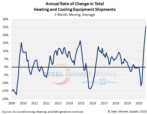 October heating and cooling equipment shipments increased to 2.08 million units, up 36.3 percent from one year prior, according to recent data from the Air-Conditioning, Heating, and Refrigeration Institute (AHRI). Total October shipments were up 2.5 percent from the previous month. For comparison, June 2020 saw the highest monthly shipment level in Steel Market Update’s 12-year history at 2.28 million units.
