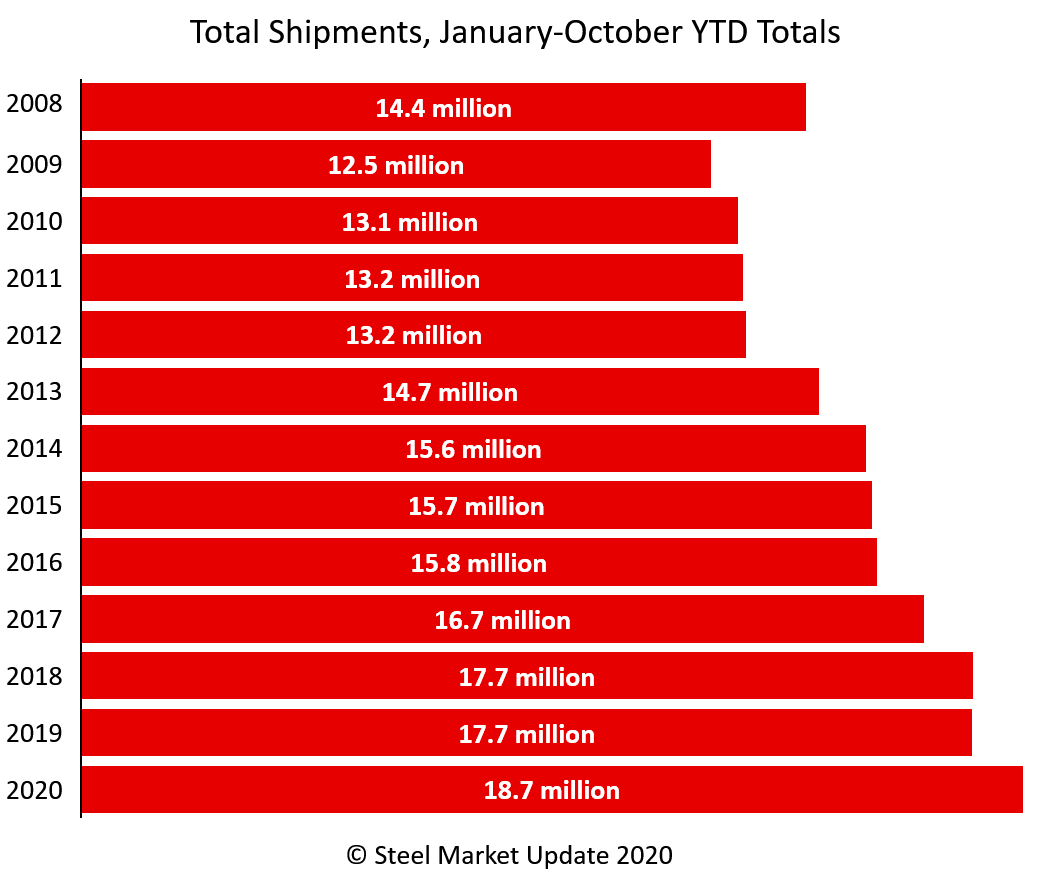 Total shipments for 2020 through October hit 18.7 million units, up 5.7 percent compared to 17.7 million units shipped in the same period of 2019. As seen in the chart below, year-to-date shipments for the first 10 months of each year are now at the highest level seen in SMU’s data history.