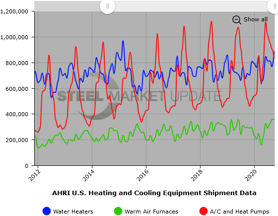 Below is a graph showing the history of total water heater, warm air furnace and air conditioner shipments. To use its interactive features, view the graph on our website by clicking here. For assistance with either logging in or navigating the website, contact Info@SteelMarketUpdate.com.