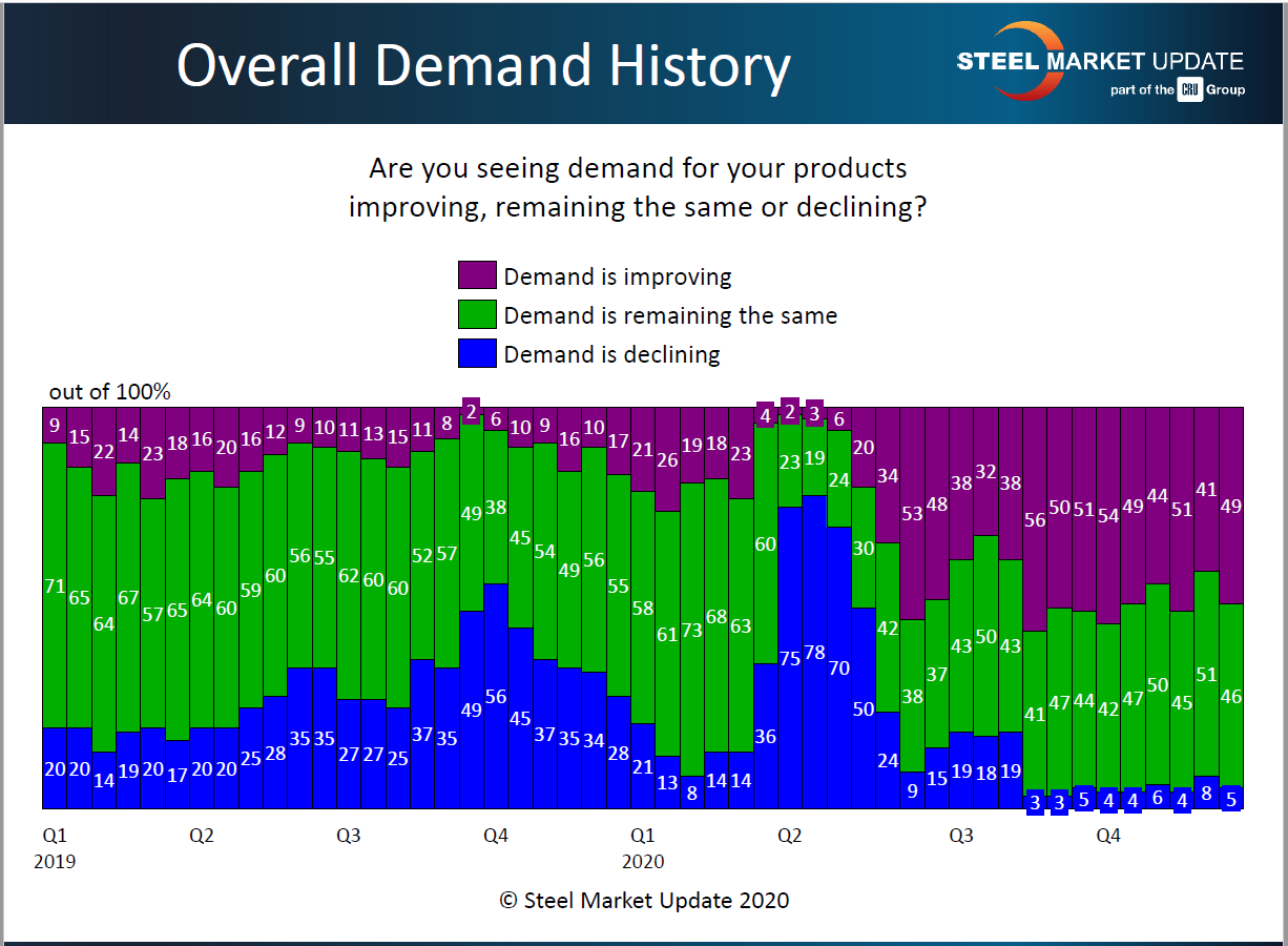 Does the current steel demand represent real consumption or is it primarily a response to the tight steel supplies? About 49 percent of the buyers responding to SMU’s questionnaire this week still report improving demand, even as steel prices hit extreme highs, while another 46 percent see demand remaining stable. Only 5 percent said demand from their customers is declining. That prevailing view of the same or rising demand has seen little change since October (see chart).