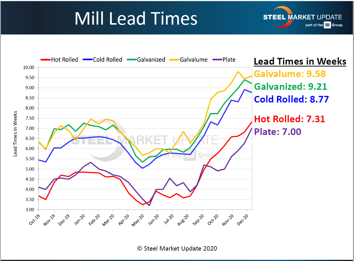 Steel Market Update estimated the average HRC price this past week at $865 per ton, with reports of offers well above $900. The mills are extremely busy, with lead times for delivery of spot orders topping seven weeks for hot rolled and nine weeks for coated products (see chart below) after rising sharply since mid-2020.