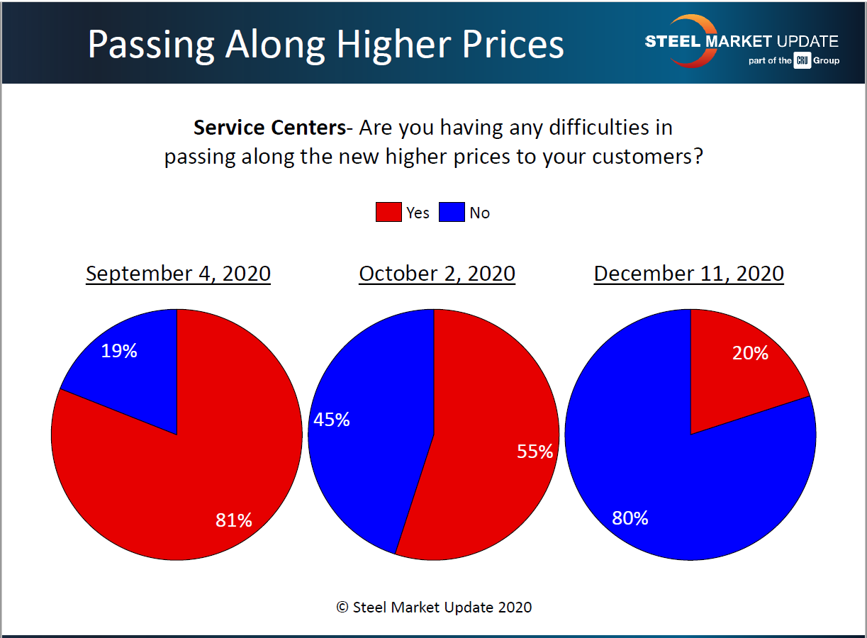 And with considerable success. Eighty-percent of the service centers polled by SMU this week said they are not having difficulty passing on higher steel prices to their customers—which is another indication that current demand is for real.