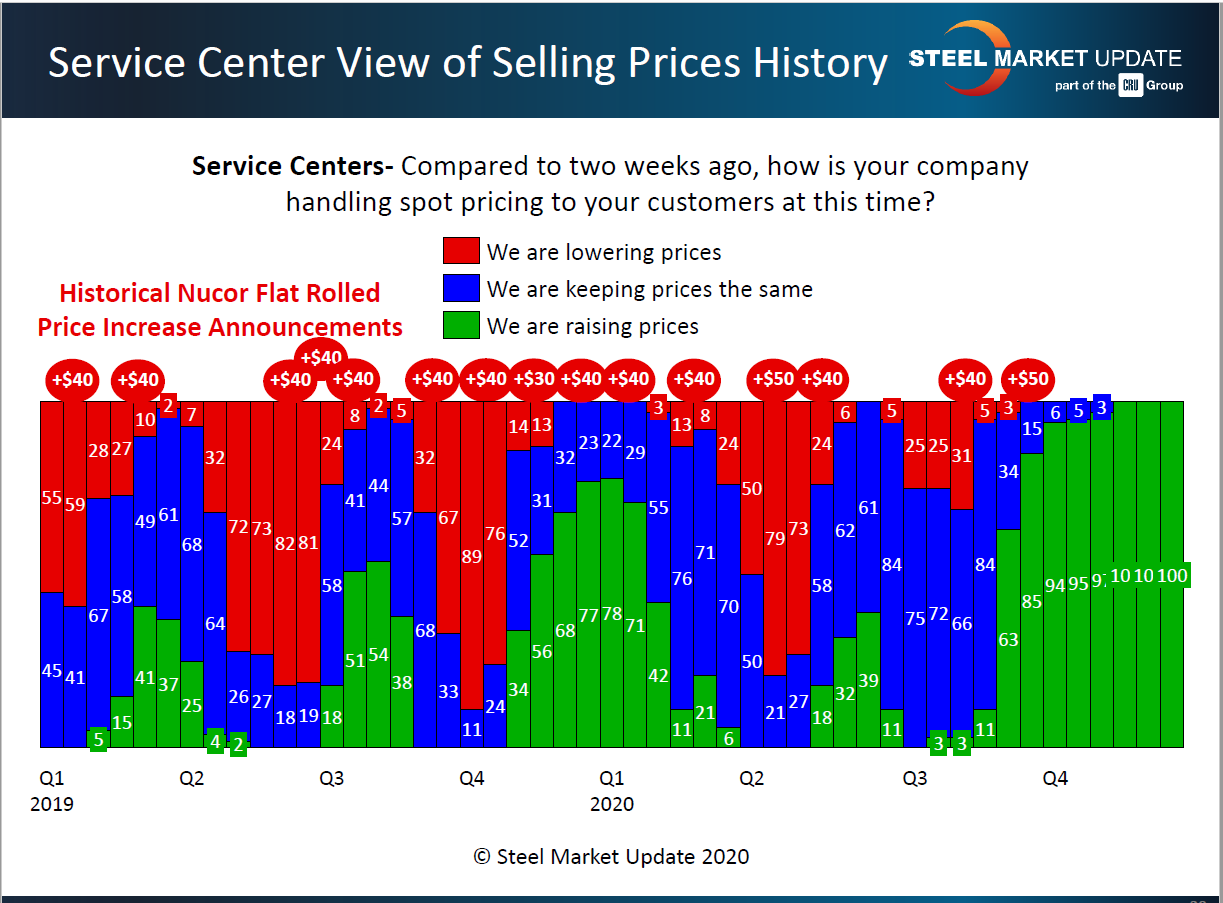 Importantly, service centers have been very supportive of the mills’ efforts to raise steel prices. As the green bars in the chart below show, virtually all service centers have been raising prices to their customers since the third quarter.