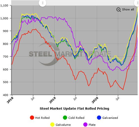 SMU Note: Below is a graphic showing our hot rolled, cold rolled, galvanized, Galvalume and plate price history. This data is available here on our website with our interactive pricing tool. If you need help navigating the website or need to know your login information, contact us at info@SteelMarketUpdate.com.
