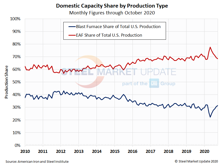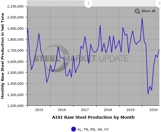 SMU Note: Interactive versions of many of these raw steel production graphics can be seen in the Analysis section of our website here. We have detailed regional data available as well, as displayed in the example below showing production from the Southeast U.S. region. If you need assistance logging into or navigating the website, contact us at info@SteelMarketUpdate.com.