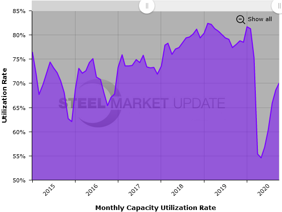 The mill capacity utilization rate for October averaged 70.1 percent, up from 68.6 percent in September, but down from 78.0 percent one year ago. The average capacity utilization rate for the year is now 67.1 percent, down from 80.1 percent in the same ten-month period of 2019.
