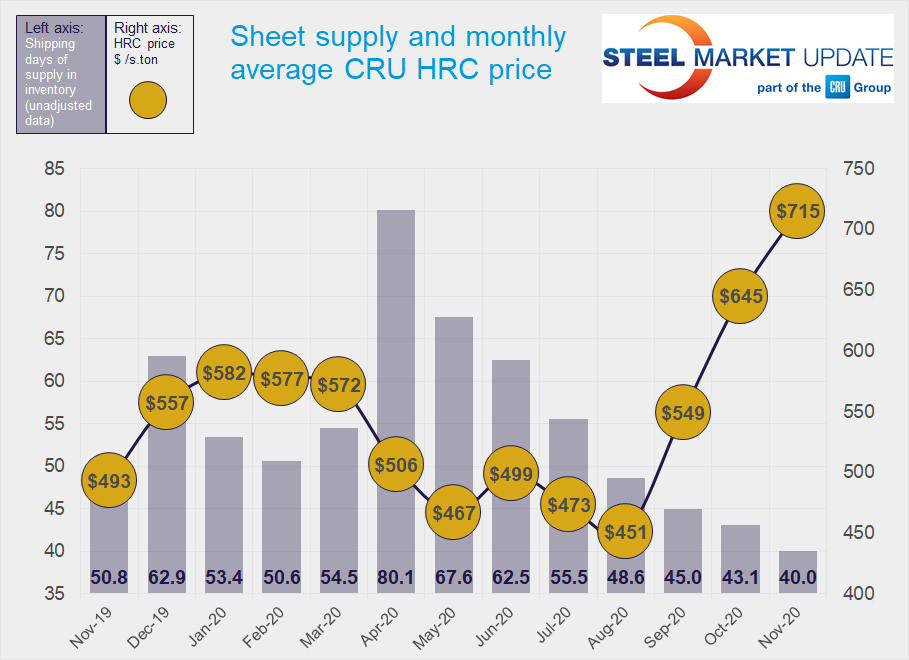 U.S. Steel’s restart of Gary Works’ No. 4 blast furnace should help to alleviate some of the market tightness. At the same time, however, mills will be facing increasing cost pressures from rapidly increasing scrap, pig iron and iron ore prices. There seems to be more runway for prices to rise with mills eyeing $1,000/st HRC, and we expect inventories to remain lean as contacts report not being able to order enough steel.