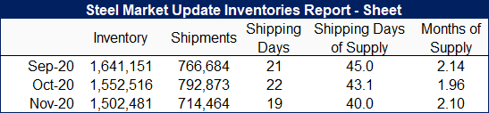 Service center flat rolled steel inventories continue to reach new lows. At the end of November, service centers carried 40 shipping days of supply, down from 43.1 days in October. November had 19 shipping days, compared to October’s 22. The shorter month made inventories appear higher when considering months of supply; service centers had 2.10 months of supply in November, which was up from 1.96 in October.