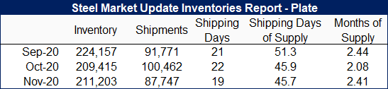 Plate inventories were nearly flat in terms of days of supply on hand. Service centers carried 45.7 days of supply at the end of November; this is down from 45.9 days in October. In terms of months of supply on hand, plate inventories represented 2.41 months of supply, up from 2.08 months in October.