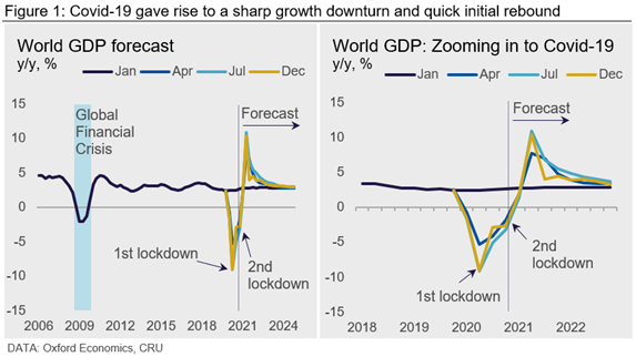 Figure 1 shows that the Covid-19 downturn has been much deeper than the downturn caused by the Global Financial Crisis, but the recovery has been much quicker. The right-hand section shows a series of forecasts for 2020 and 2021, made by CRU at different points in 2020. Note that forecasts for 2020 were downgraded during the year as new data became available. As the virus continued to spread, further restrictions in Europe during October and November meant that a second dip in activity is expected in the final quarter of this year and the first part of 2021.