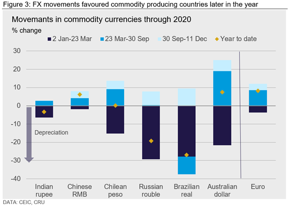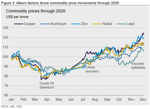 Commodity prices have had a bumpy ride this year (Figure 2). They began their descent in February when the Covid-19 outbreak was at its height in China. Prices reached a low point in mid-March, by which time the virus had been declared a pandemic by the WHO. They stayed flat at around 15% below January levels until May 2020. Over the summer the outlook for commodity demand and prices started to recover, following the economic rebound in China. The rebound was particularly strong for industrial metals, given the impact of China’s stimulus on traditional (metal-intensive) infrastructure projects. Prices stabilized again in the autumn, before moving up again in November. This recovery was driven by growing confidence in the economic recovery, following positive vaccine developments.