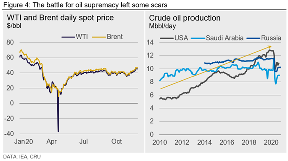 2020 will be remembered as the year in which the West Texas Intermediate (WTI) oil price briefly turned negative, for the first time in history. Our insight in March explained that the negative price was the result of a combination of supply and demand shocks (Figure 4).