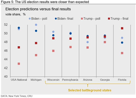 In the event, Biden’s lead in the popular vote was about half of what had been expected, but still substantial, at roughly 4.5 percentage points (Figure 5). More importantly, once the votes had eventually been counted, it became clear that Biden had won narrow victories in several of the key marginal states. This propelled him to an electoral college victory of 306 to 232, a much wider margin than the popular vote (of around 14 percentage points compared to 4.5).