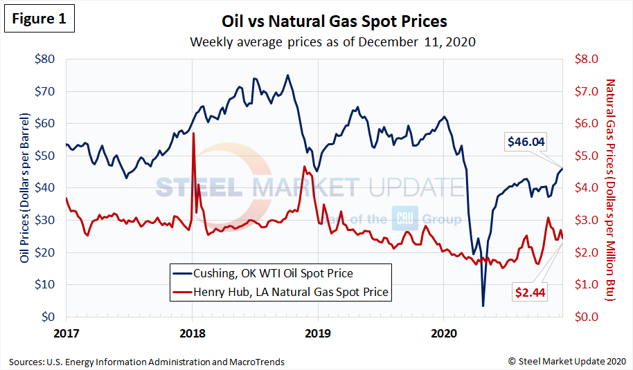 The spot market price for West Texas Intermediate (WTI) has risen since early-November, at $46.04 per barrel as of Dec. 11. Natural gas at the Henry Hub in Oklahoma was priced at $2.44 per MMBTU (million British Thermal Units) as of last week, down from the annual-high previously reported in late-October.