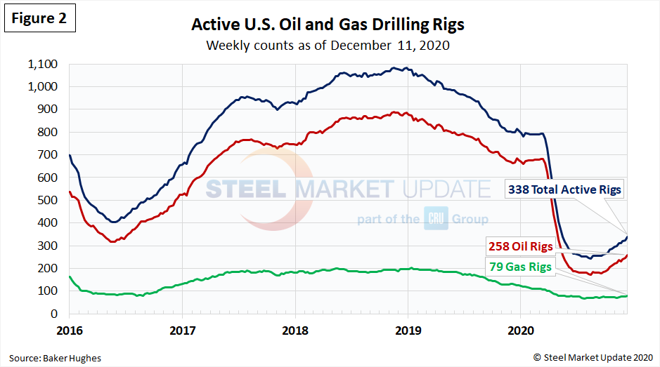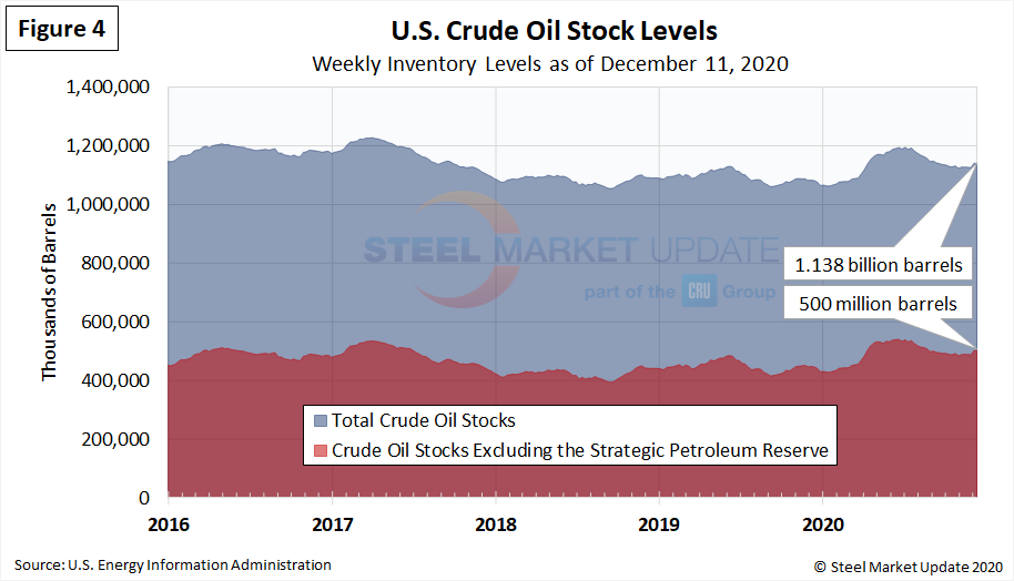 U.S. total crude oil stocks in 2020 had surged from mid-March through July, then steadily declined through October. The latest level is 1.138 billion barrels as of Dec. 11, up from 1.066 billion barrels at the beginning of the year (Figure 4).