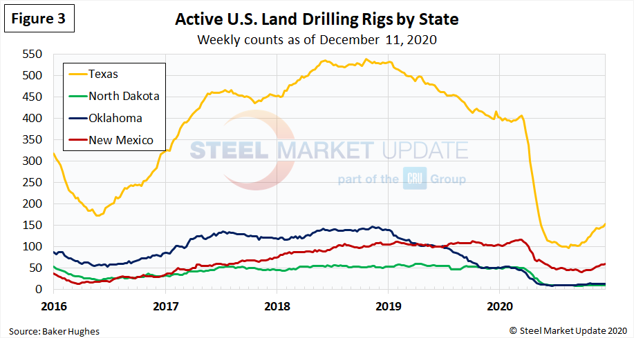 U.S. oil and gas production are heavily concentrated in Texas, Oklahoma, North Dakota and New Mexico, which have all seen declines of 49 to 78 percent since mid-March. The most active state, Texas, now has 154 active rigs in operation, the highest level seen since early May 2020. Texas rigs had plummeted from 407 in mid-March to 97 rigs in mid-August (Figure 3).