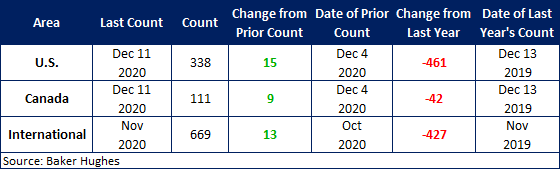 The decline in active U.S. rigs drilling for oil and gas flattened in late-August and has continued to improve each week since. Last week there were 338 active drill rigs, comprised of 258 oil rigs, 79 gas rigs and 1 miscellaneous rig, according to the latest data from Baker Hughes (Figure 2). While up over recent months, active drill rigs are down 57 percent from the March peak of 793 rigs, just prior to the coronavirus shutdowns. The table below compares the current U.S., Canada and International rig counts to historical levels.