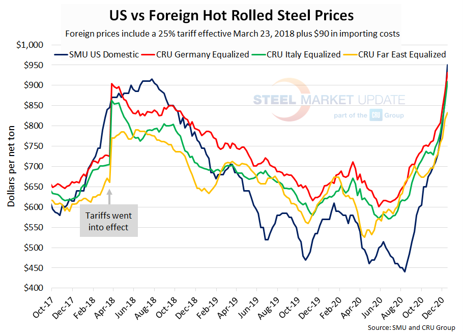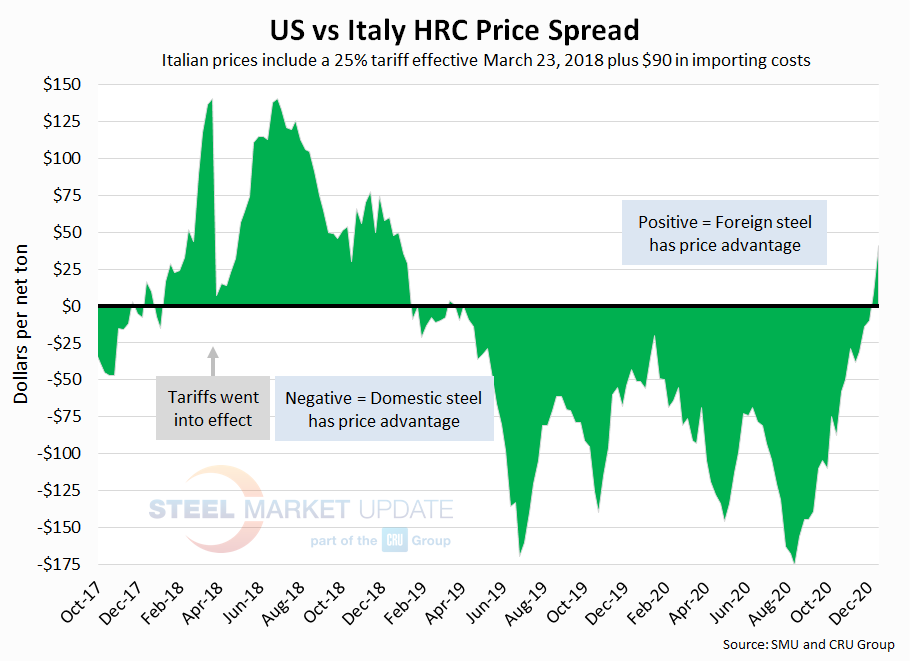 The following calculation is used by Steel Market Update to identify the theoretical spread between foreign hot rolled steel prices (delivered to U.S. ports) and domestic hot rolled coil prices (FOB domestic mills). This is only a “theoretical” calculation as freight costs, trader margin and other costs can fluctuate, ultimately influencing the true market spread. This compares the SMU U.S. hot rolled weekly index to CRU hot rolled weekly indices for Germany, Italy and Far East Asian ports.