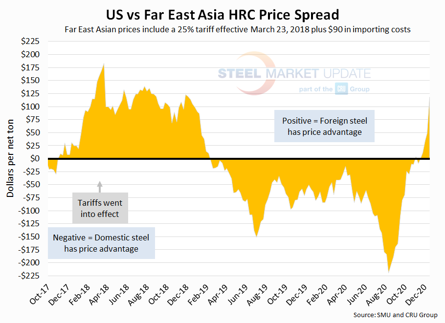 As of Wednesday, Dec. 16, the CRU Far East Asian HRC price rose $13 per ton over last week to $594 per net ton, $50 higher than the price two weeks ago. Adding tariffs and import costs, the delivered price of Far East Asian HRC to the U.S. is $833 per ton. The latest SMU hot rolled price average is $950 per ton, up $85 over last week and up $145 from two weeks prior. Therefore, U.S.-produced HRC theoretically is now $118 per ton more expensive than imported Far East Asian HRC. Asian imports, which had been more expensive than domestic for more than a year and a half, gained their price advantage in November. In mid-August, domestic HRC held a record-high $220 per ton price advantage over Far East Asian HRC.