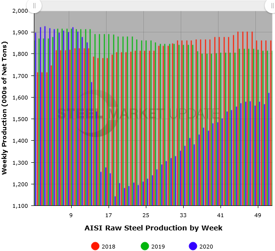 Adjusted year-to-date production through Dec. 26 totaled 78,739,000 net tons, at an average utilization rate of 67.7 percent. With one week left in 2020, that’s down 17.7 percent from the same period last year, when the utilization rate was 79.8 percent, AISI said.