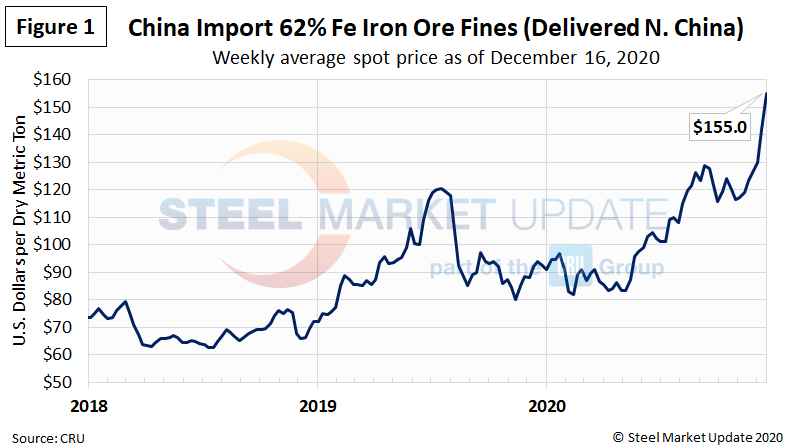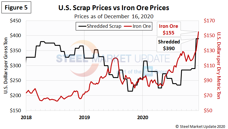 Figure 5 shows the recent spread between the price of iron ore, at $155 per dry metric ton, and shredded scrap at $390 per gross ton. Ore has steadily moved higher since May.