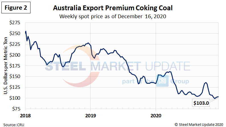 The price of premium low volatile coking coal FOB east coast of Australia had jumped up in September/October, then declined to a low of $98.5 in late-November. Prices have slightly recovered since, currently at $103.0 dollars per dry metric ton as of Dec. 16 (Figure 2). The seaborne coking coal price has not been able to fully benefit from the strong demand in China due to import restrictions. Recent coking coal prices remain at their lowest levels seen in SMU’s limited history.