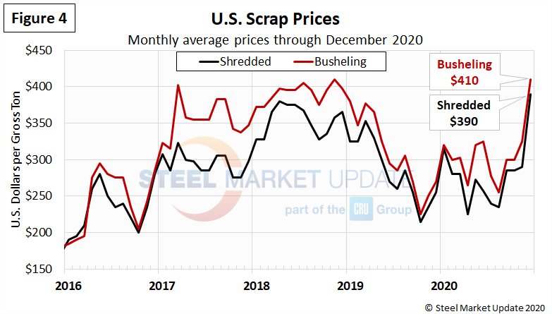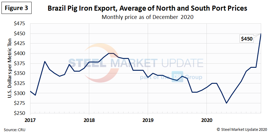 Most of the pig iron imported to the U.S. currently comes from Russia, Ukraine and Brazil. This report summarizes prices out of Brazil and averages the FOB value from the north and south ports. The latest data through December shows an average pig iron price of $450 per metric ton, up 23 percent in just one month, and up 64 percent from the May 2020 low of $275. Pig iron prices had declined since mid-2018, but have risen each month since June 2020 (Figure 3).