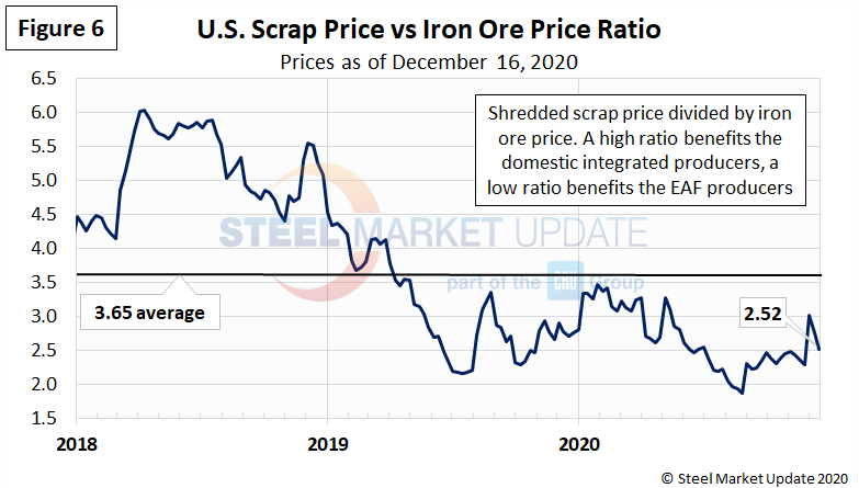 To compare the two, Steel Market Update divides the shredded scrap price by the iron ore price to calculate a ratio (Figure 6). A high ratio favors the integrated/BF producers, a lower ratio favors the minimill/EAF producers. As the 2.52 ratio shows, minimills continue to hold a more competitive cost advantage. This ratio hit an all-time low of 1.86 in late-August 2020 (in our 12+ year limited data history).