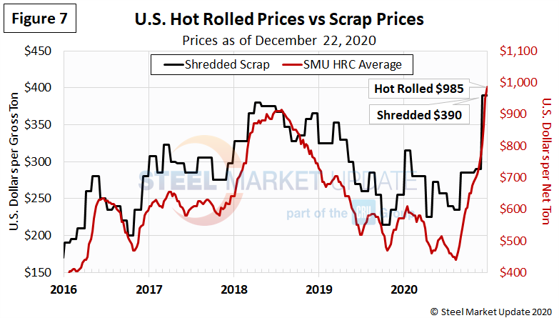 Figure 7 shows how the price of hot rolled steel generally tracks with the price of shredded scrap. Shred rose by approximately $100 from November to December, while hot rolled prices have risen $215 per ton over since late-November.