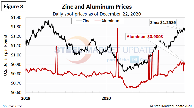 Zinc, used to make galvanized and other products, has steadily risen since March, reaching an 18-month high last Friday (Figure 8). The LME cash price per pound of zinc as of Dec. 22 was $1.2586, up 53 percent from the mid-March low of $0.8236. The price of zinc factors into the coating extras charged by the mills for galvanized products. Many mills have revised their coating extras upwards in December to reflect the higher zinc price. Aluminum prices, which factor into the price of Galvalume, have also been trending upwards over the last few months. Note that aluminum prices often have large swings and return to typical levels within a few days, as seen in the graphic below. The LME cash price per pound of aluminum was $0.9008 as of Dec. 22.