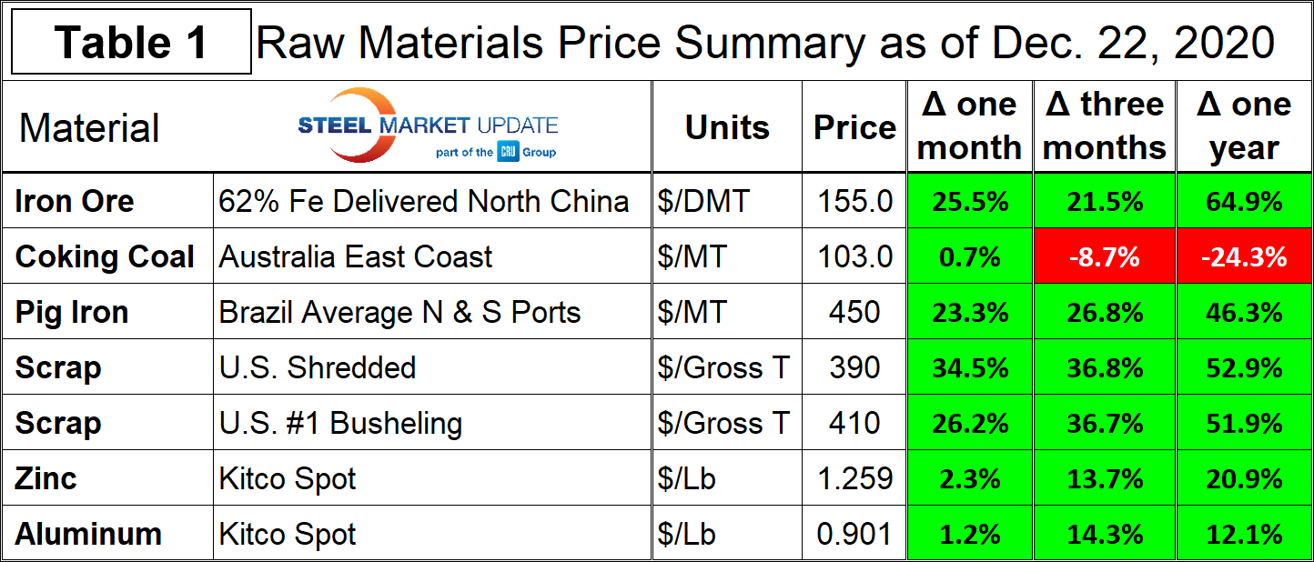 Table 1 summarizes the price changes through Dec. 22 of the seven materials considered in this analysis. It reports the month/month, three months/three months and year/year changes as a percentage.