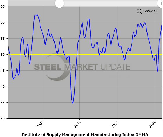 Below is a graph showing the history of the ISM Manufacturing Index. You will need to view the graph on our website to use its interactive features; you can do so by clicking here. If you need assistance logging in to or navigating the website, please contact us at info@SteelMarketUpdate.com.