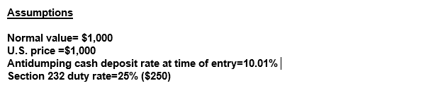 After the Commerce decision: The cash deposit two or three years earlier remains $100, but after the deduction of Section 232 duties the U.S. price falls to $750, creating an antidumping duty of $250 on this shipment where none existed before. Instead of a refund, the importer will get a bill from U.S. Customs for $150 ($250 minus the $100 cash deposit).