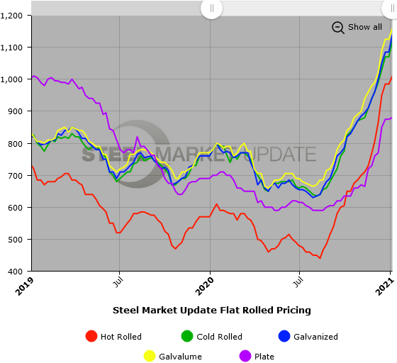 SMU Note: Below is a graphic showing our hot rolled, cold rolled, galvanized, Galvalume and plate price history. This data is available here on our website with our interactive pricing tool. If you need help navigating the website or need to know your login information, contact us at info@SteelMarketUpdate.com.