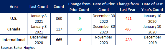 The number of active U.S. rigs rose by 9 this week to 360, with oil rigs up 8, gas rigs up 1, and miscellaneous rigs unchanged. Compared to this time last year, this week’s count is down 421 rigs, with oil rigs down 384, gas rigs down 35, and miscellaneous rigs down 2. See the first graph below for a history of active U.S. rig counts.