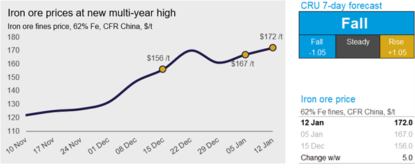 Iron ore prices continued to rise over the past week. Due to offloading constraints at Chinese ports, iron ore port inventories declined, contributing to the recent price hike. On Tuesday, Jan. 12, CRU assessed the 62% Fe fines price at $172.0 /dmt, $5.0 /dmt higher w/w.