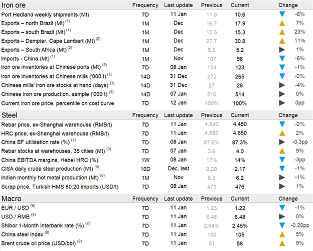 Chinese steelmaking output and iron ore appetite remain robust. Though BF capacity utilization edged down as more BFs were put under maintenance, iron ore demand remained high on steel mills’ restocking demand following the truck transportation disruptions in Hebei province that limited iron ore availability in the previous week. The vessel queue at Chinese ports has been increasing again as adverse weather conditions are limiting vessels’ offloading. Together with rising port outflows, this resulted in a sharp ~1.5 Mt w/w decrease in iron ore inventories at ports. The strong Chinese demand and low inventory levels are two of the main reasons behind the high level of iron ore prices. The rising vessel queue at Chinese ports summed with strong Brazilian exports in December is also having an impact on the freight market, with freight rates jumping by around 20% w/w.