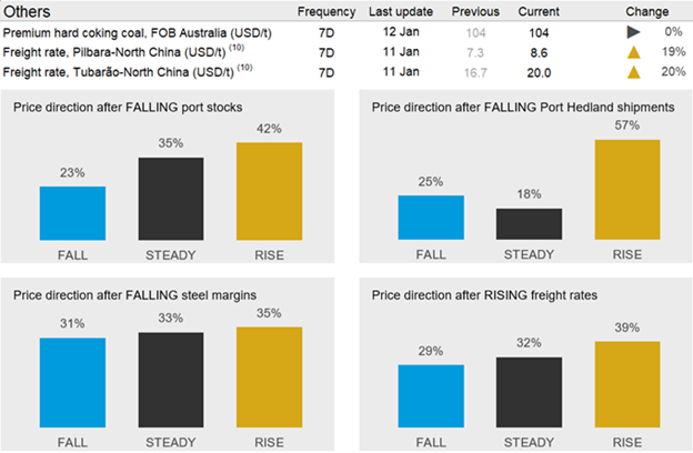 In the coming week, we expect prices to decline though upside risks remain. While the seaborne supply, especially from Australia, is expected to remain strong, Chinese buying interest will also be on the high side as steelmakers start to restock iron ore prior to the Chinese New Year holiday in mid-February. Despite such mixed supply/demand signals, we expect weather conditions in China will improve, allowing iron ore offloading to increase. This will help lift port stocks, contributing to lower prices.