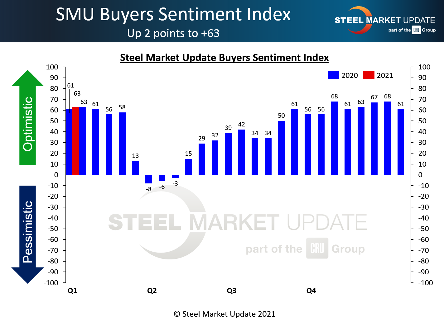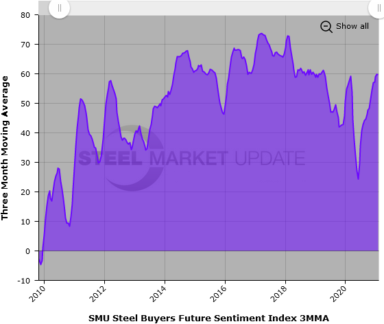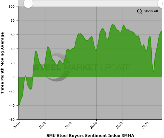 SMU Steel Buyers Sentiment Index is a measurement of the current attitude of buyers and sellers of flat rolled steel products in North America regarding how they feel about their company’s opportunity for success in today’s market. It is a proprietary product developed by Steel Market Update for the North American steel industry.