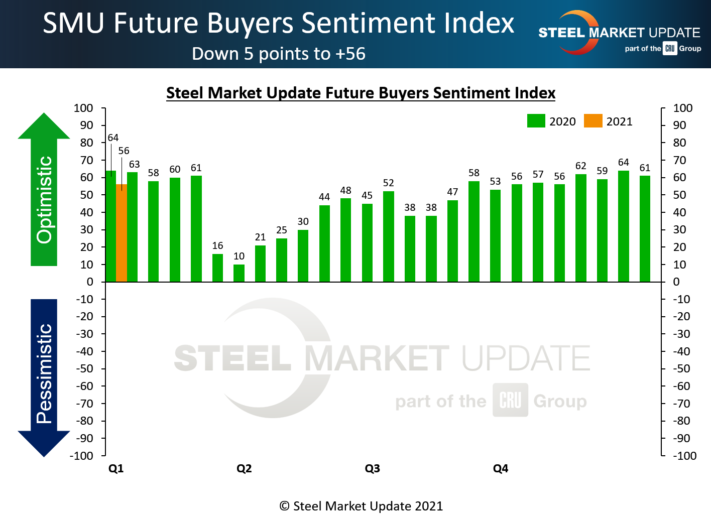 SMU’s Future Sentiment Index moved down by five points, however, to register +56 on concerns over the limited availability of steel and fears of a big price correction later this year. Yet sentiment about the coming few months remains above the average of +48 in 2020 and +51 in 2019 before the pandemic was a factor.