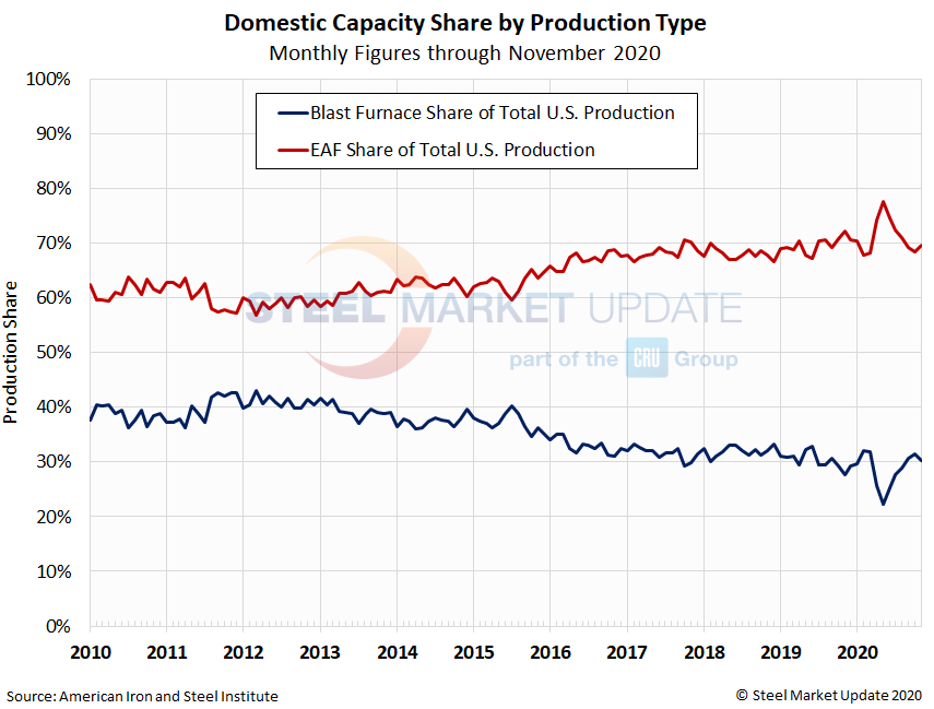 November raw production was 86,000 tons higher than in October, but down 865,000 tons (11.1 percent) compared to the same month one year prior. November production was above the 2020 monthly average of 6,640,000 tons. The January-November 2019 monthly average was 8,064,000 tons.
