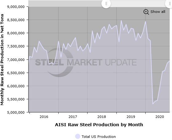 AISI’s monthly raw steel production estimates are different than the weekly estimates SMU reports each Tuesday; the monthly estimates are based on over 75 percent of the domestic mills reporting versus only 50 percent reporting for the weekly estimates. Monthly production data is released 4-6 weeks after the end of each month.