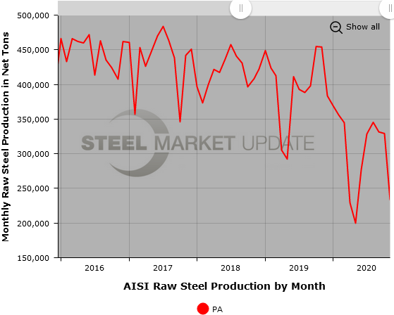 SMU Note: Interactive versions of many of these raw steel production graphics can be seen in the Analysis section of our website here. We have detailed regional data available as well, as displayed in the example below showing production from the Pennsylvania region. If you need assistance logging into or navigating the website, contact us at info@SteelMarketUpdate.com.