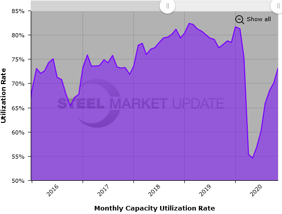 The mill capacity utilization rate increased to 73.3 percent in November, up from 70.1 percent in October, but down from 78.8 percent one year ago. The average capacity utilization rate for the year is now 67.7 percent, down from 80.0 percent in the same 11-month period of 2019.
