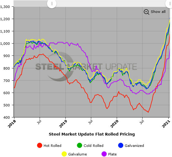 SMU Note: Below is a graphic showing our hot rolled, cold rolled, galvanized, Galvalume and plate price history. This data is available here on our website with our interactive pricing tool. If you need help navigating the website or need to know your login information, contact us at info@SteelMarketUpdate.com.